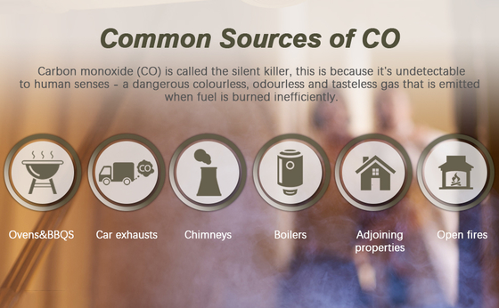 | 50-199ppm | アラームレベルI、リアルタイムCO濃度を表示、赤色ライトが点滅し、ブザーが鳴る |